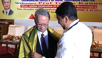 Prof. S.M. Balaji honoring Prof. Tetsuo Kanno, Honorary President, World Federation of Neurosurgical Societies, Founder President, American Clinical Neurophysiological Society, and Honorary Professor of Neurosurgery, Fujita Health University, Japan who was the Chief Guest at the function